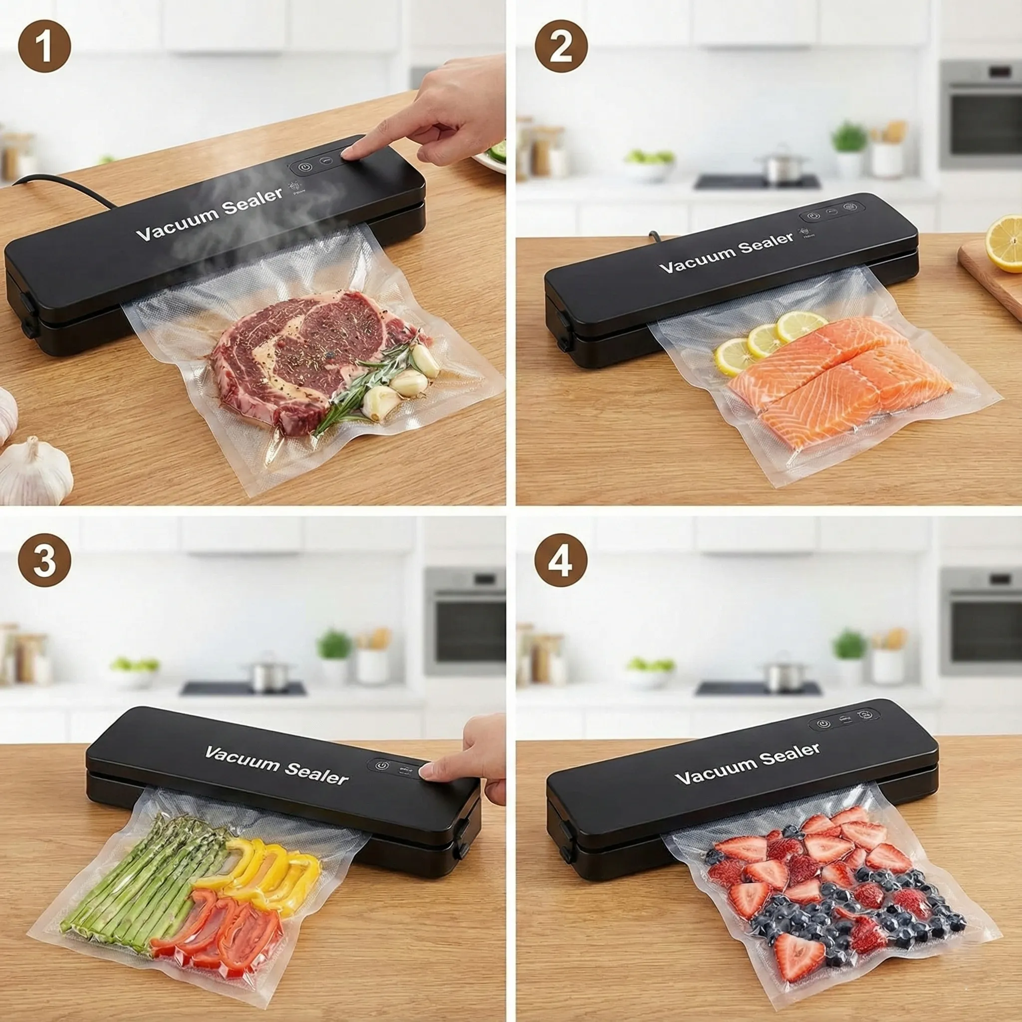 Este incredibil de ușor de folosit, având o operare simplă cu un singur buton, ceea ce îl face accesibil oricui. Designul său modern și compact înseamnă că nu va ocupa mult spațiu pe blatul de bucătărie și poate fi depozitat cu ușurință într-un sertar. Fie că vrei să porționezi carnea pentru săptămâna viitoare, să păstrezi brânzeturile proaspete sau să pregătești ingredientele pentru gătitul sous-vide, acest aparat face totul posibil.