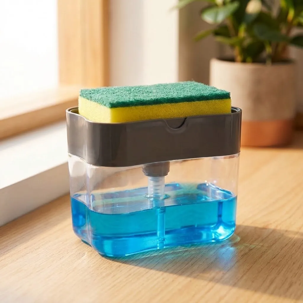 Inovația constă în structura compactă care ocupă locul unei singure sticle de detergent, dar îndeplinește două roluri vitale. Partea inferioară stochează o cantitate generoasă de detergent, în timp ce platforma superioară servește drept suport stabil pentru burete. Acest lucru eliberează blatul de bucătărie de obiecte împrăștiate, creând un aspect vizual curat și profesional.