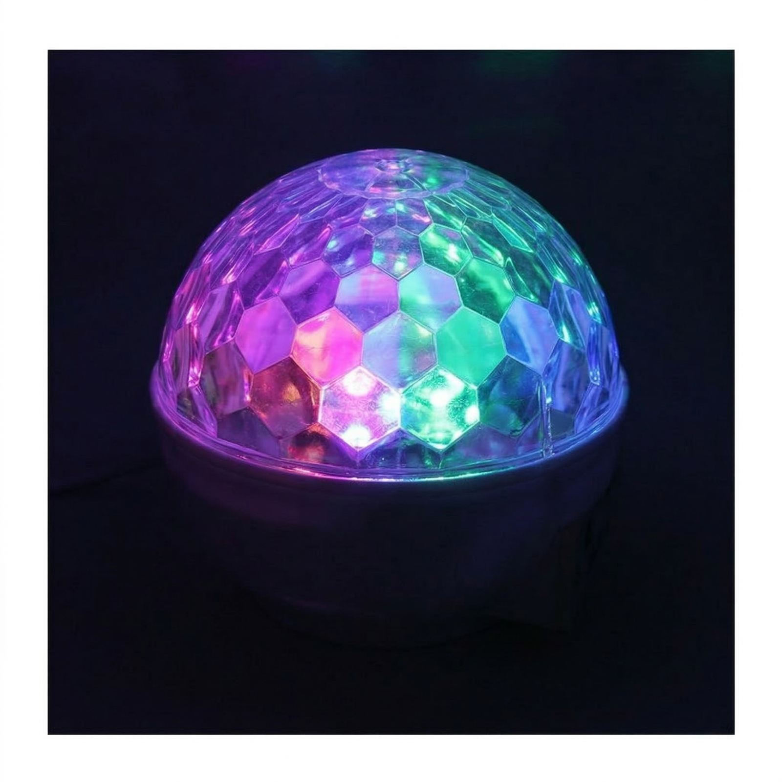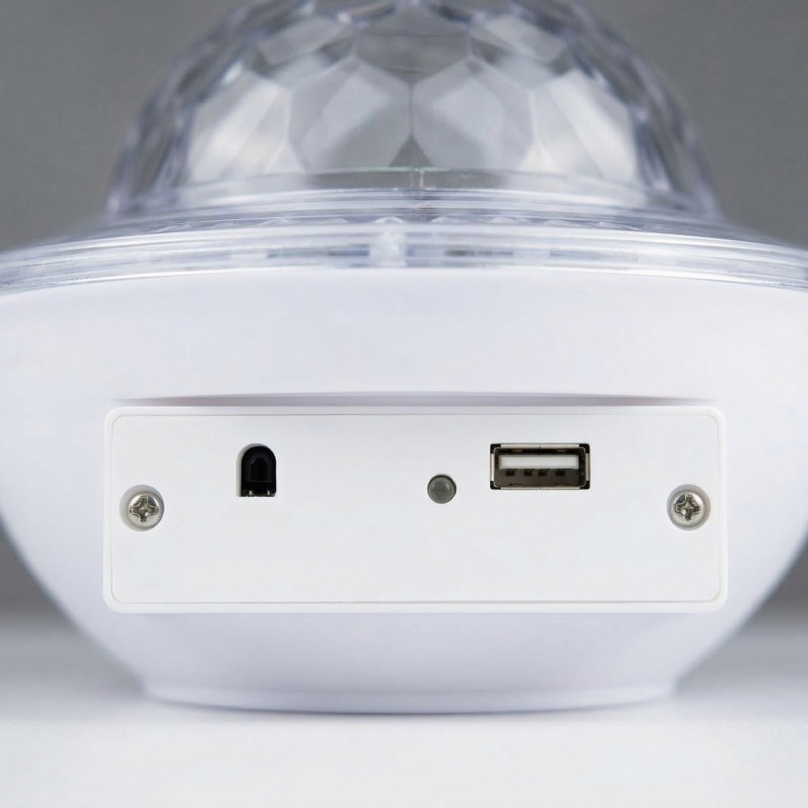Designul său sub formă de cupolă de cristal transparent proiectează modele multicolore fascinante pe pereți și tavan, acoperind un unghi larg de iluminare. În același timp, difuzoarele stereo integrate îți permit să asculți muzica preferată direct de pe telefon prin Bluetooth sau de pe un stick USB, oferind un sunet clar și puternic.