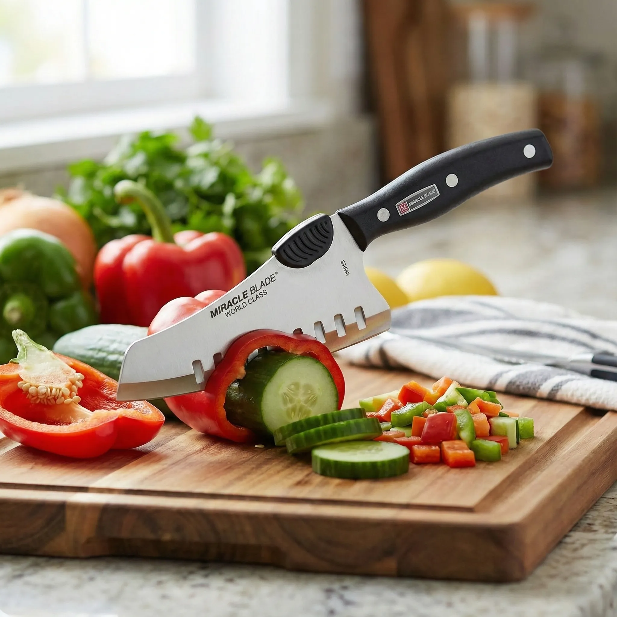 Spre deosebire de lamele plate obișnuite care creează fricțiune, fața concavă a cuțitelor Miracle Blade permite aerului să pătrundă între lamă și aliment. Rezultatul? O tăiere rapidă, curată și incredibil de precisă, indiferent dacă lucrezi cu legume crocante, brânzeturi lipicioase sau fripturi suculente.