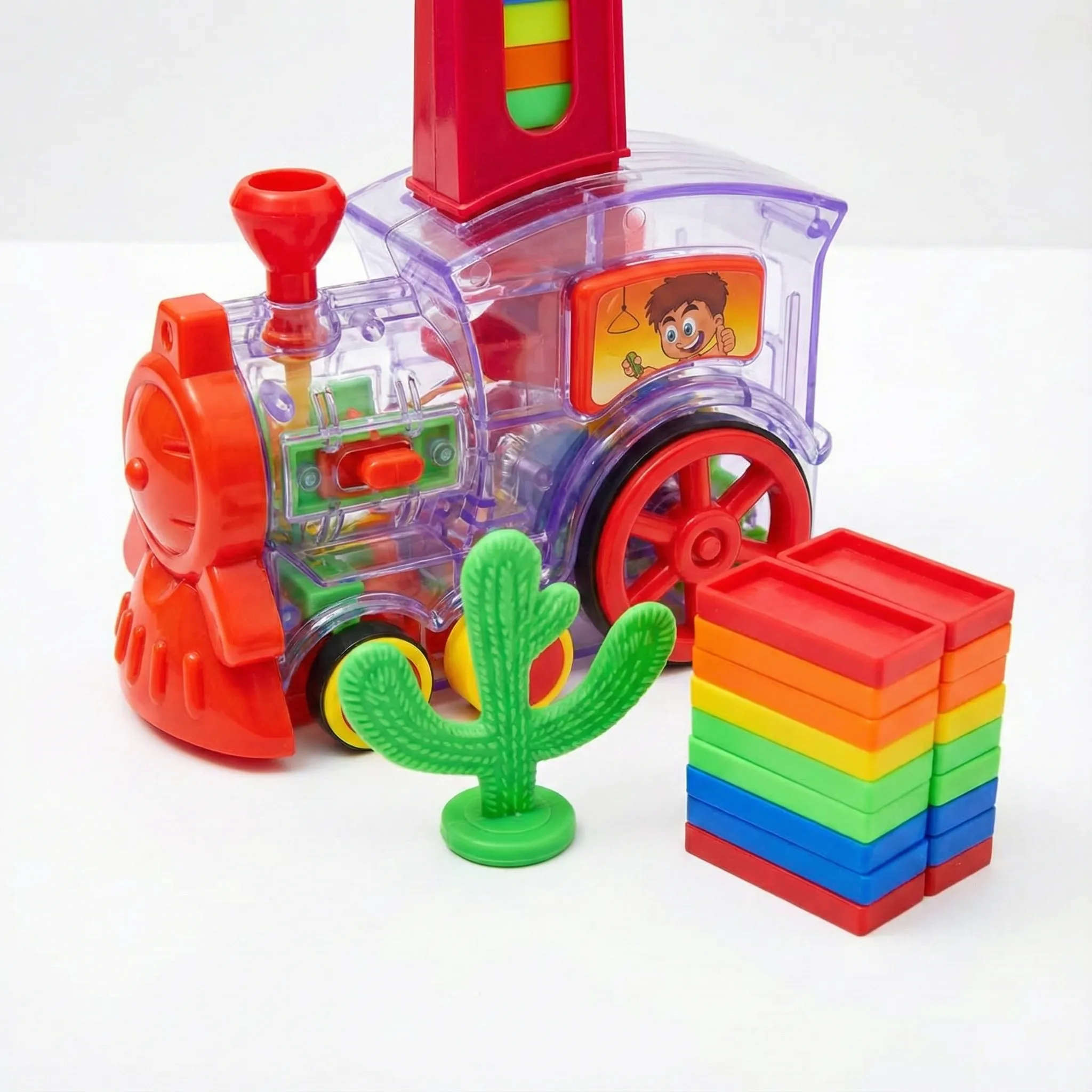 Distribuire Automată și Precizie (Mecanism Inteligent): Inovația principală constă în capacitatea trenulețului de a plasa piesele de domino la intervale perfect egale în timp ce se deplasează. Copiii pot controla direcția trenului prin rotirea coșului, creând trasee complexe, drepte sau curbate, pe care piesele vor cădea impecabil.